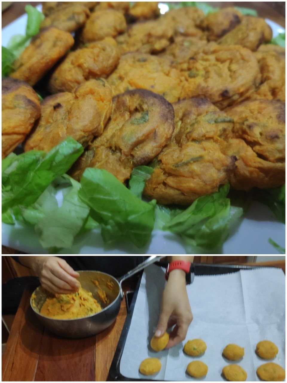 מועכים את הבטטות, מוסיפים בצל ירוק, סויה, ג'ינג'יר קמח, אבקת קארי, מלח ופלפל. מערבבים עד לקבלת תערובת אחידה.