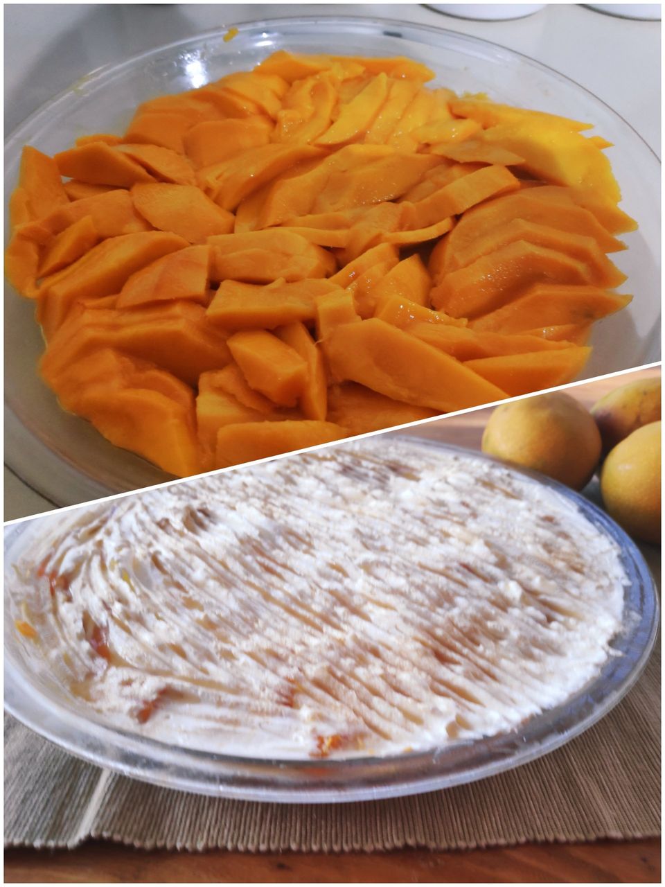 מערבבים את היוגורט עם 1/2 חבילה שמנת לבישול ומסדרים מעל המנגו