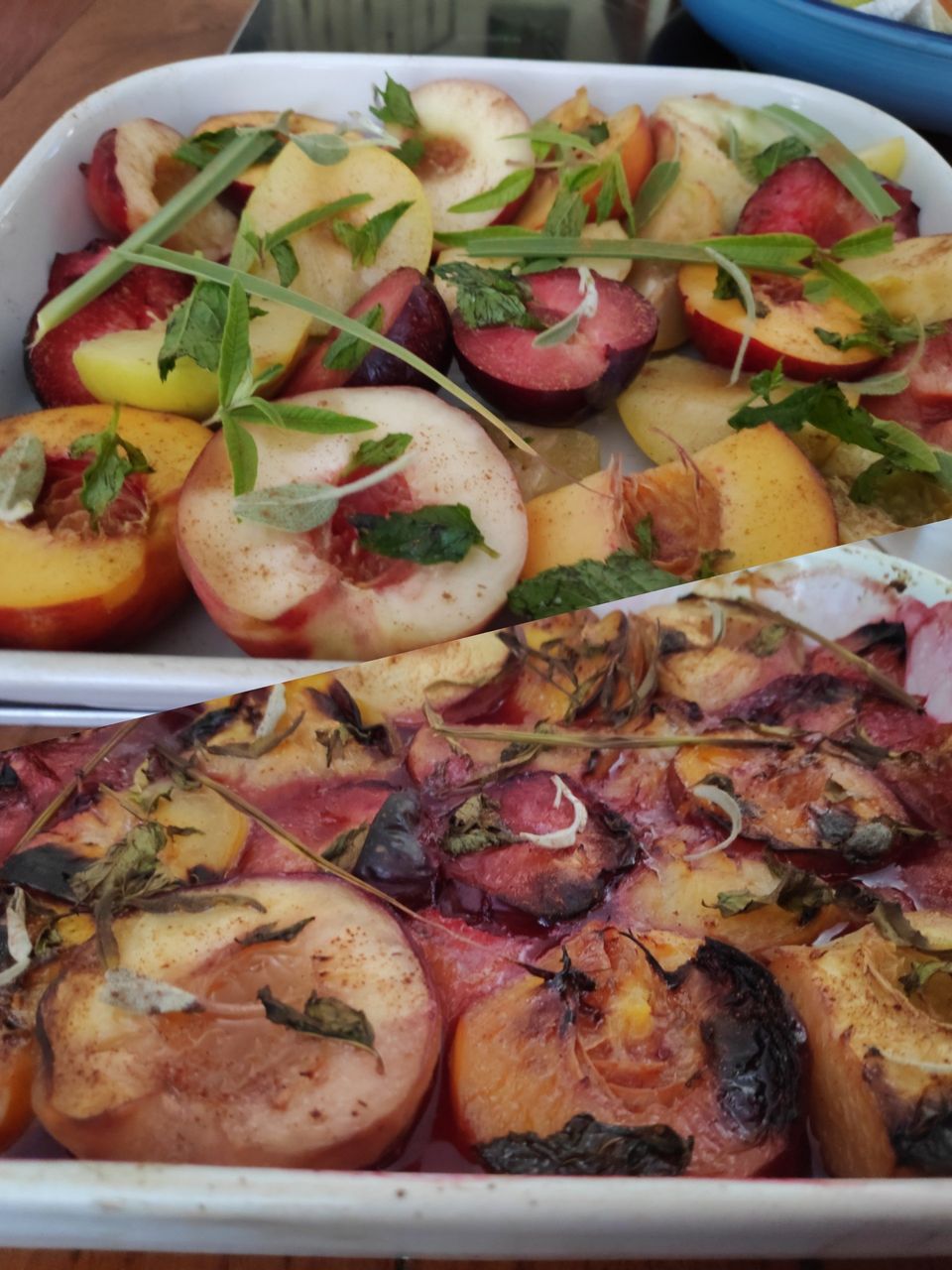 לחתוך אץ הפירות לחצי לסדר בתבנית חסינת בחום